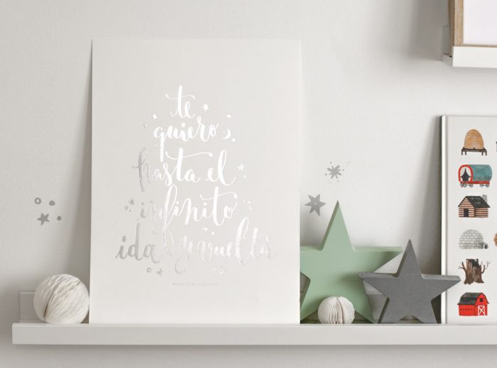 ¡Ya tenemos aquí la lámina plateada que tanto nos pedíais! Nuestra lámina “Mi lugar favorito” edición dorado que ha gustado tanto ya tiene una compañera en versión plata… Si eres amante de la decoración y estás siempre a la última, la lámina “Te quiero hasta el infinito ida y vuelta” especial edición PLATA… ¡¡¡tiene que estar en tu casa!!!