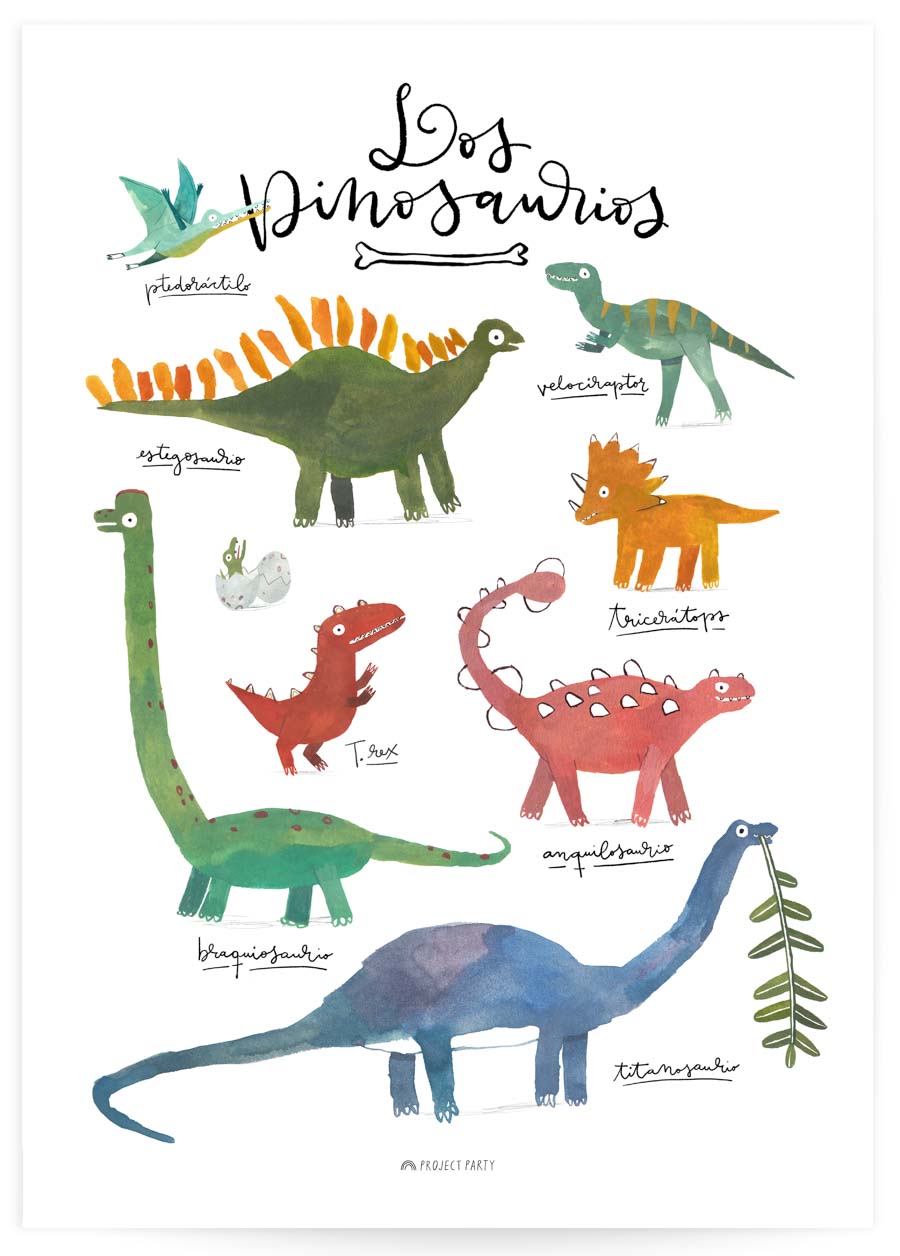 Cada dinosaurio está ilustrado con mucho mimo y cariño en acuarelas y todos los textos están hecho a mano con un divertido lettering.