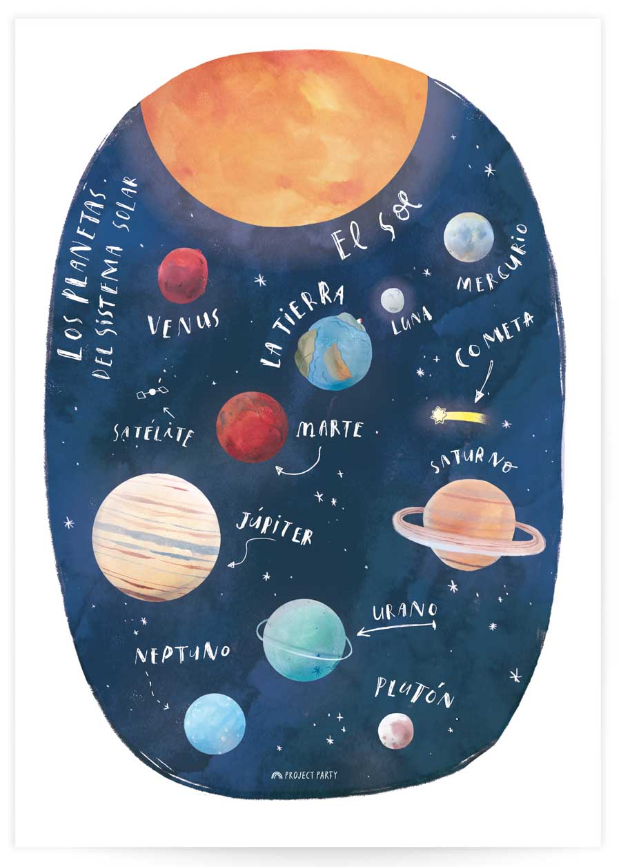 La lámina está ilustrada con mucho mimo y cariño en acuarelas y todos los textos están hecho a mano con un divertido lettering. La lámina de los planetas para niños y niñas es un must have en la habitación de cualquier peque que sueña con ser astronauta y viajar a la luna cuando sea mayor.