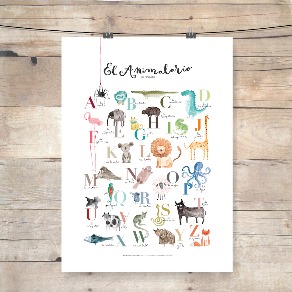 Puedes combinar esta lámina con otras láminas de animales en diferentes tamaños, puedes colgarla o apoyarla en una balda junto con el abecedario “Animalario” y con otras láminas que encontrarás en nuestra web.