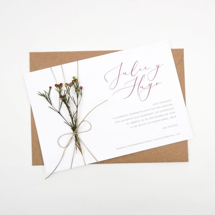 Todas las flores seleccionadas son naturales y están especialmente tratadas para que no se rompan y mantengan el encanto de las flores recién cortadas. ¡Elige la invitación que más te guste y combínala con la flor que mejor se adapte a tu boda!