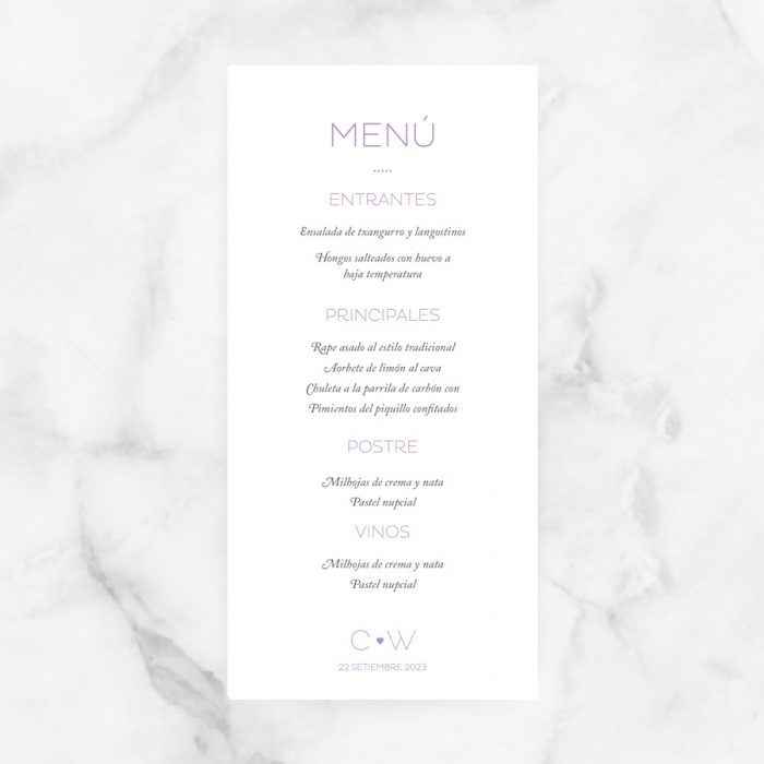 Minuta de boda personalizada con el menú que se servirá en vuestra boda y, si lo queréis, también se puede agregar el nombres, iniciales de los novios y la fecha de la boda. El precioso diseño del menú de boda Lilia además de vestir la mesa será un recuerdo inolvidable del banquete de la boda.