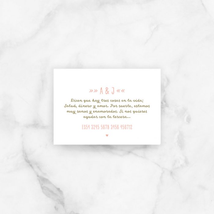 ¡Todos los invitados querrán hacer un regalo en este día tan importante! Facilítales las cosas a tus invitados y pon junto a tus invitaciones de boda una tarjeta de lista de bodas o número de cuenta bancaria para que puedan hacer su regalo. Sabemos que no es fácil escoger que texto poner en la tarjeta de la lista de bodas por eso hemos recopilado los textos más bonitos y divertidos que usamos en Project Party para que te inspires, puedes ver aquí las frases para la tarjeta de regalo boda.